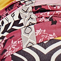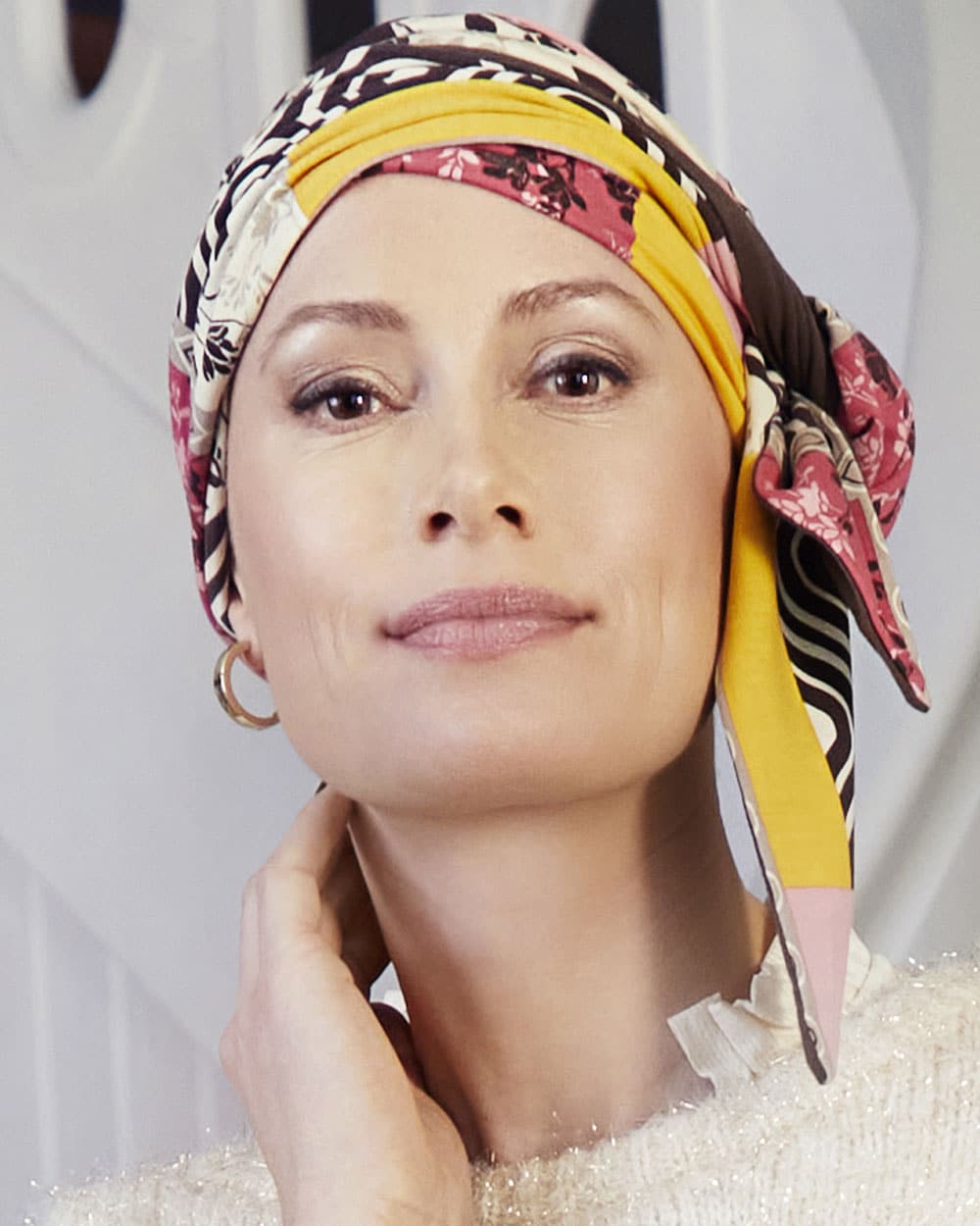 BEATRICE ist ein vorgebundener Turban, der ganz easy wie eine Mütze aufgesetzt wird – hier in einem schönen Print in Hellbeige-Braun-Rosa-Hibiskus-Pink-Sonnengelb.