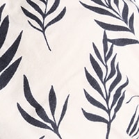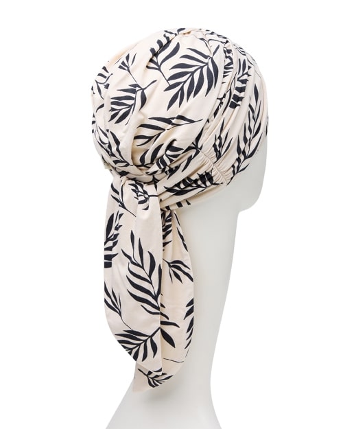 BEATRICE ist ein vorgebundener Turban, der ganz easy wie eine Mütze aufgesetzt wird – hier in Sandbeige mit Blätter-Print in Schwarz.