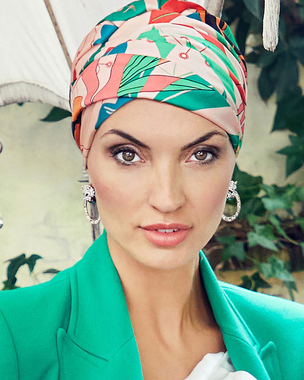 Die Sapphire-Turbane haben ein angenähtes, breites Stirnband, das durch seine Falten schön Volumen schafft. Der Stoff sieht aus wie Seide und fühlt sich auch so an. Der Turban mit weicher Bambus-Viskose/Elastan gefüttert.