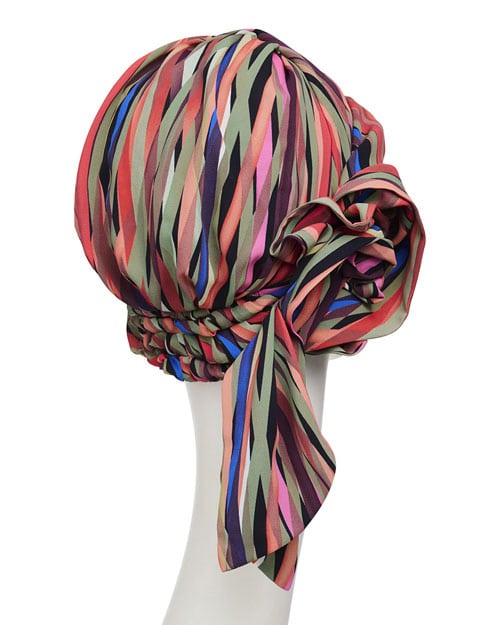 Der Turban ist ein bisschen „baggy“ geschnitten, so dass Ihr ihn im Nacken etwas überhängen lassen könnt. Das schafft einen luftig-lockeren Style. Der Oberstoff ist eine fein-gewebte Ware, die sich wie Wildseide anfühlt. Innen ist der Turban mit der beliebten Bambus-Viskose/Elastan gefüttert, die sich sehr angenehm auf der Kopfhaut trägt.