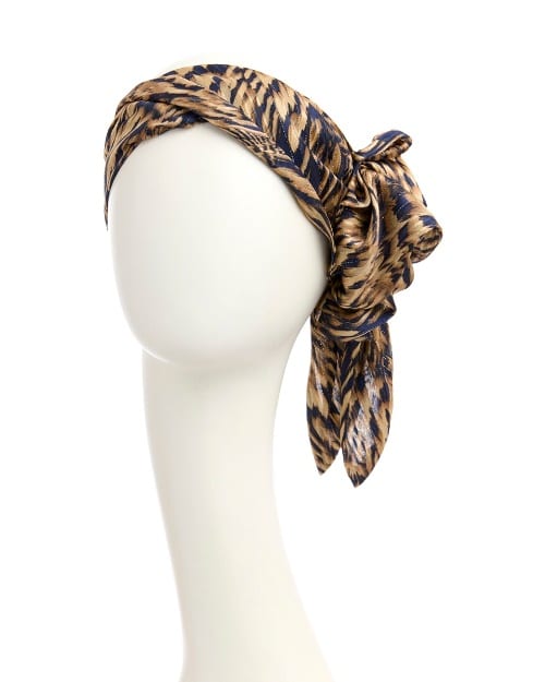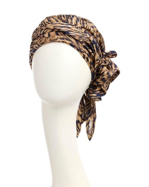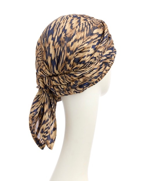 Der Turban ist ein bisschen „baggy“ geschnitten, so dass Ihr ihn im Nacken etwas überhängen lassen könnt. Das schafft einen luftig-lockeren Style. Innen ist er mit weichem Baumwoll-Viskose-Elastan-Mix gefüttert, das sich sehr angenehm auf der Kopfhaut trägt. Der Oberstoff ist eine fein-gewebte Crêpe-Ware in Taupe-Beige-Braun-Blau mit dezentem Schimmer.