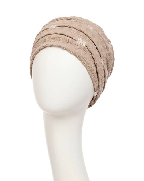 In jeder Winterkollektion von Christine Headwear gibt es in der BOHO-Kollektion ein neues RUBY-SKYE-Modell, das immer die schönen Ziersteppungen hat. Dieses Mal kommt der RUBY-SKYE-Turban in elegantem Sandbeige. Die schöne Stoffstruktur könnt ihr im Detailfoto gut erkennen.