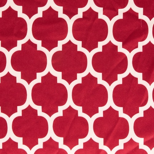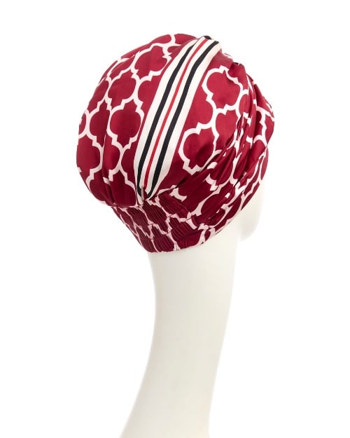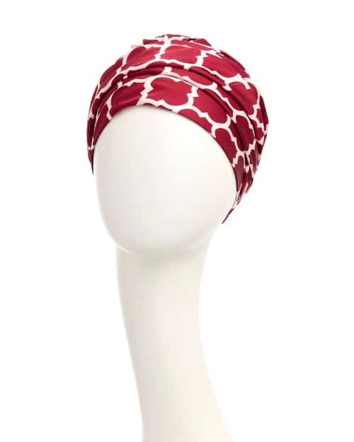 Die Turbane dieser Kollektion haben ein angenähtes, breites Stirnband, das durch seine Falten schön Volumen schafft. Der Stoff sieht aus wie Seide und fühlt sich auch so an – hier in einem ausdrucksstarkem Rot-Ton mit Cremeweiß.