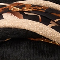Das Stirnband besteht aus verschiedenen Bändern und Schnüren in Beige-Braun-Tönen, die miteinander verflochten sind. Durch die verschiedenen Stoffe und Muster dieses Flechtwerks entsteht ein extravaganter Look.