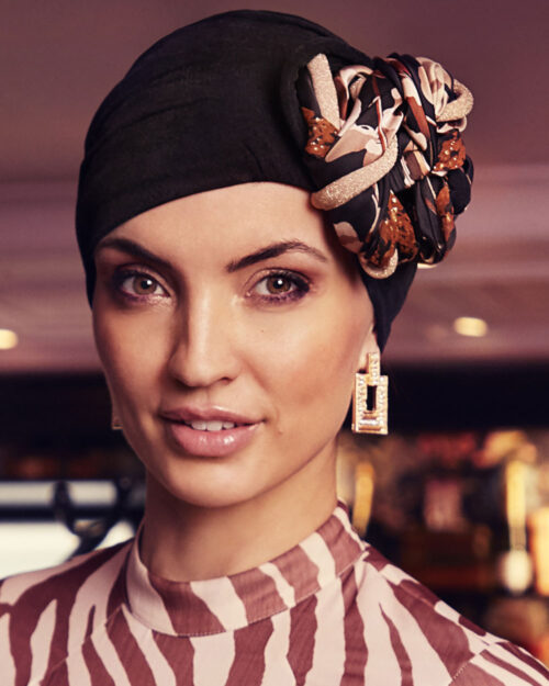 Der Turban besteht aus einer hochwertigen Poly-Faser mit Elastan in schimmerndem Schwarz . Er ist großzügig und ein bisschen „baggy“ geschnitten, so dass Ihr ihn im Nacken etwas überhängen lassen könnt. Das schafft einen luftig-lockeren Style. Innen ist er mit weichem Viskose-Elastan-Mix gefüttert, das sich sehr angenehm auf der Kopfhaut trägt.