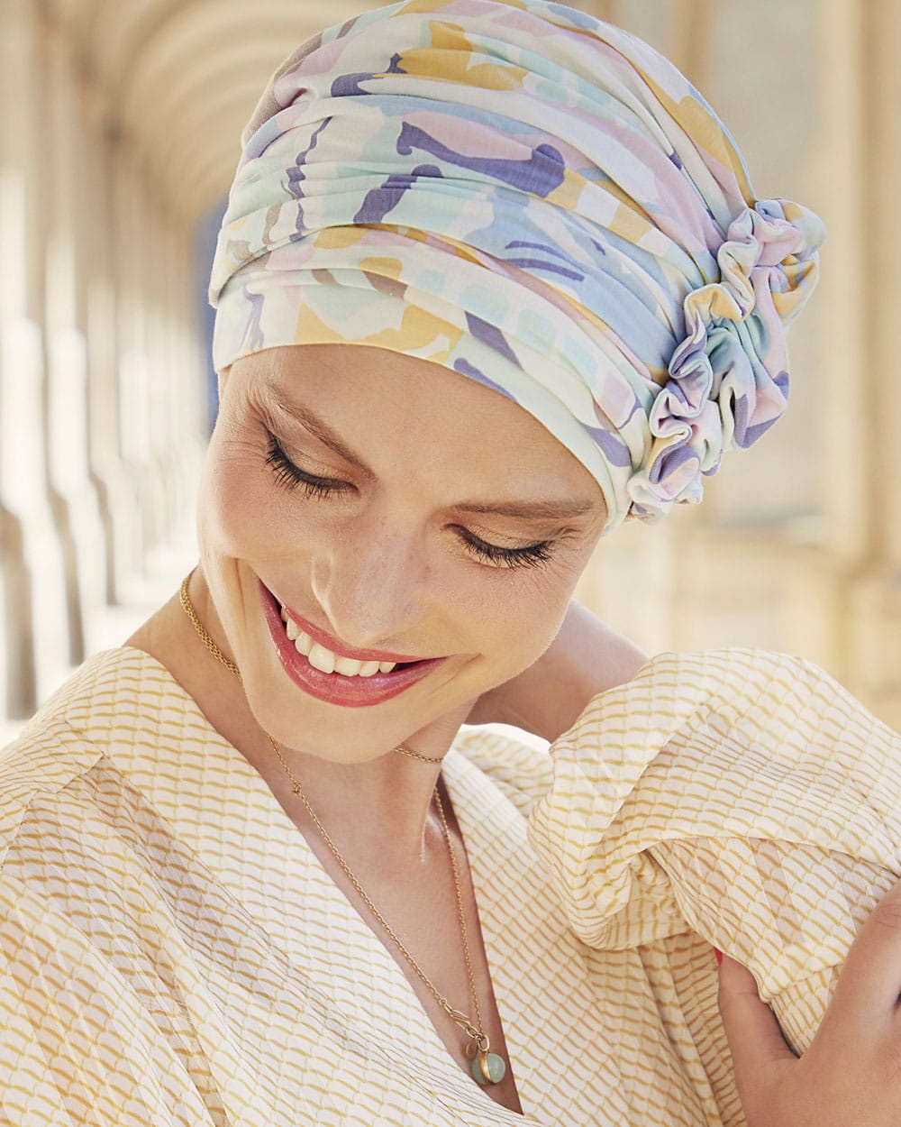 Der LOTUS-Turban „Sorbet-Blue“ ist ein bequemer Turban für mittlere bis größere Kopfgrößen. Die zarten Pastell-Töne schaffen ein schönes Summer-Feeling – hellblau, flieder, zartgelb, cremeweiß.
