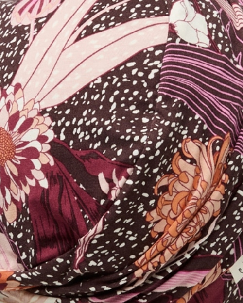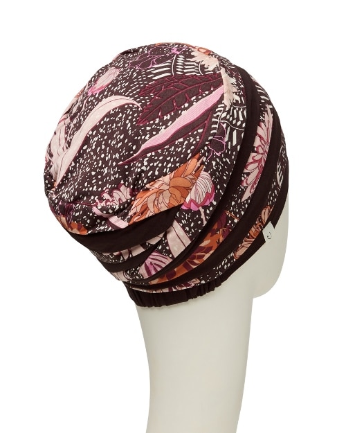 Turban von Christine Headwear in schönen warmen Farben mit Blütenmuster in Apricot, Rosé, Cremebeige, Bordeaux und Aubergine – für kleine bis mittlere Kopfgrößen.