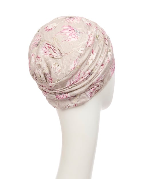 In der neuen Sommer-Kollektion gibt es den beliebten YOGA-Turban auch in einer Leinen-Version. Es ist ein zarter, pastelliger Print von rose-pinkfarbenen Blüten der Cap-Rose (Protea). Das Obermaterial ist kühlendes Leinen – sehr angenehm bei sommerlichen Temperaturen. Das Futter ist wie immer die bekannte, weiche Bambus-Viskose.