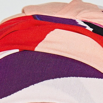 Der grafische Print mit Farben wie Apricot, Rosé, Violett, Royalblau, Schwarz und Rot macht Lust auf Sommer und lässt sich vielfach kombinieren.